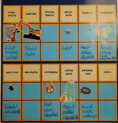 - Lapset laittavat sauna-alustan yhteen laatikkoon ja toiseen uimalasit ja -puku.